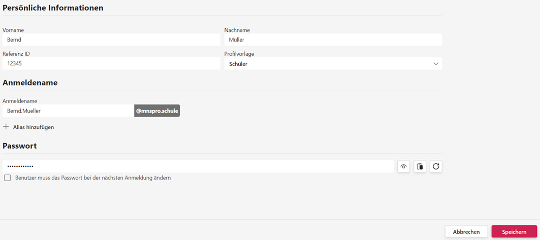 Gewöhnen Sie sich in dem Zuge auch direkt an, eine Referenz-ID zu vergeben. Diese weist eine Person eindeutig aus und dient dem System später bei der Zuordnung von Personen per Benutzerimport in MNSpro. Dies ist insbesondere bei einem Schuljahreswechsel von Relevanz, da das System im privaten oder öffentlichen Ordnerbereich hochgeladene Daten immer zuordnen kann, selbst dann, wenn sich der Name des Nutzers ändert.