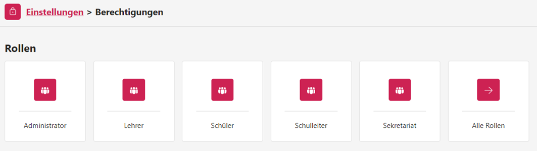 Zu Beginn öffnen Sie bitte die Kachel Berechtigungen (Abb. 1). Dann gelangen Sie zur Seite, auf der Sie bestehende Berechtigungen anpassen können, neue Rollen erstellen können und Rechteinhaber für bestimmte Rollen hinzufügen oder entfernen können (siehe Abbildung 6).