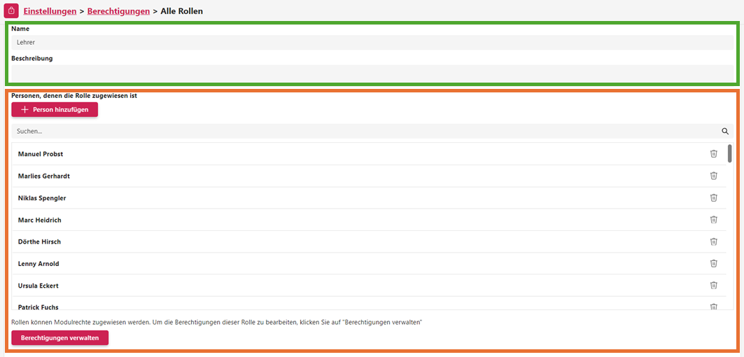 Über den Button Person hinzufügen können Sie weitere Personen zu dieser Rolle hinzufügen. Diese Personen werden dann im darunter befindlichen Feld angezeigt. Ebenso können Sie Personen, die einer Rechtegruppe zugeordnet sind, über diese Übersicht durch Klicken auf das Mülltonnen-Icon entfernen.