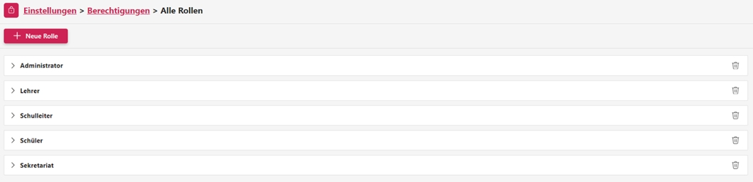 Standardmäßig hat Ihnen die AixConcept GmbH die Rollen der Lehrer, Administratoren, Schüler, Schulleiter und des Sekretariats hinterlegt. Sie können jedoch auch eine eigene Rechterolle definieren, indem Sie auf die Kachel Alle Rechte (siehe Abbildung 5) und dann auf Neue Rolle klicken (siehe Abbildung 9).