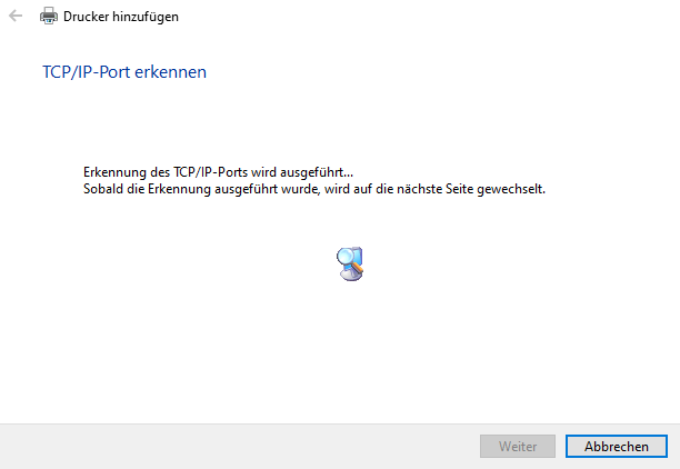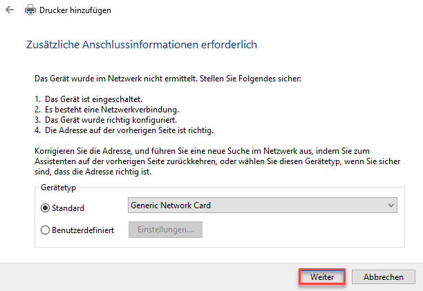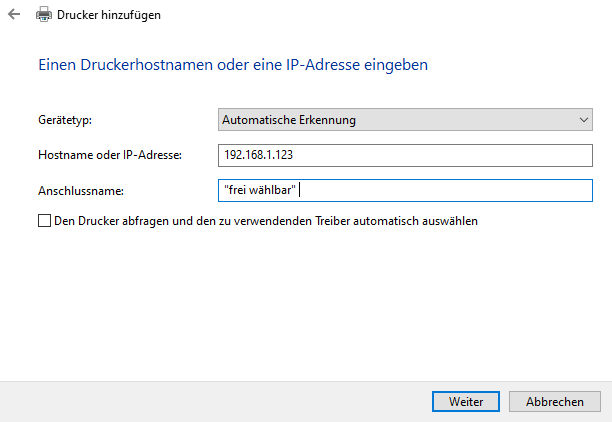 „Den Drucker abfragen und den zu verwendenden Treiber automatisch auswählen“ nicht anhaken