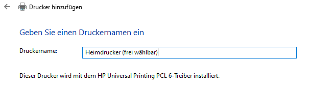 Anschließend muss noch der anzuzeigende Druckername festgelegt werden. Dieser kann frei gewählt werden und durch Klick auf „Weiter“ wird der Drucker installiert.
