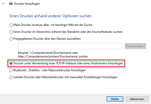 Wählen Sie nun den Punkt „Drucker unter Verwendung einer TCP/IP-Adresse oder eines Hostnamens hinzufügen“ aus.