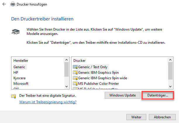 Der darauffolgende Schritt dient der eigentlichen Treiberinstallation. Hier wählen Sie „Datenträger“ aus und navigieren in das Verzeichnis, wo der Treiber hinterlegt ist.