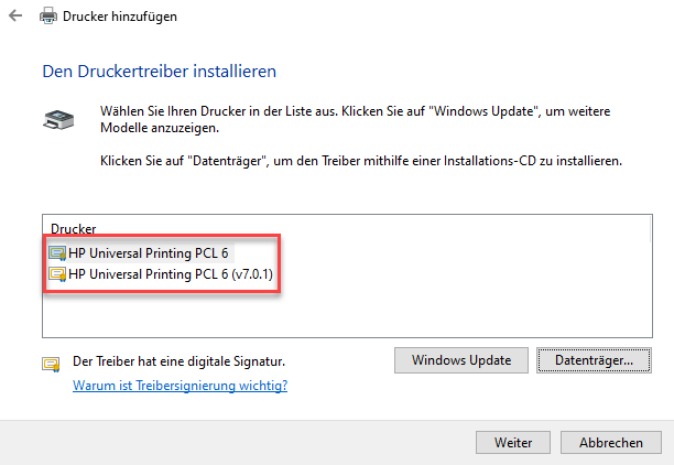 Haben Sie das richtige Verzeichnis ausgewählt, wird Ihnen der entsprechende Treiber angezeigt und Sie können durch Klick auf „Weiter“ bestätigen und fortfahren.