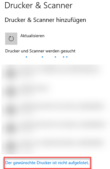 Der PC sucht nun nach verfügbaren Druckern in der Nähe. Wählen Sie hier jedoch die Option „Der gesuchte Drucker ist nicht aufgelistet.“