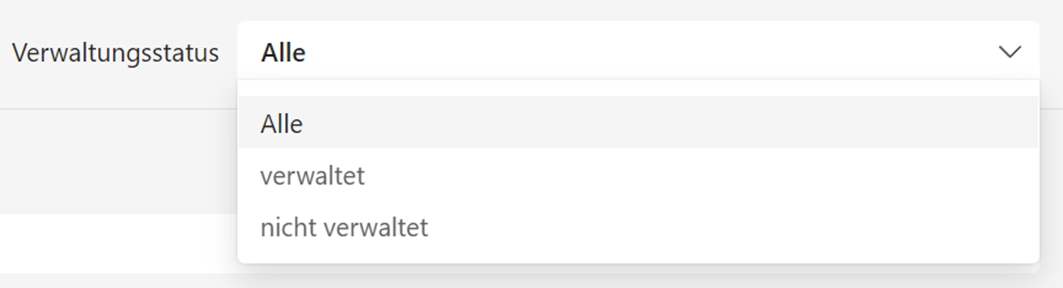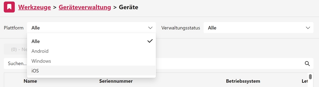 Die Filterleiste soll Ihnen helfen, die Liste der angezeigten Endgeräte sinnvoll zu filtern. Als Filteroptionen stehen Ihnen dabei die Plattform sowie der Verwaltungsstatus (siehe Abbildung 35) zur Verfügung (siehe Abbildung 36).