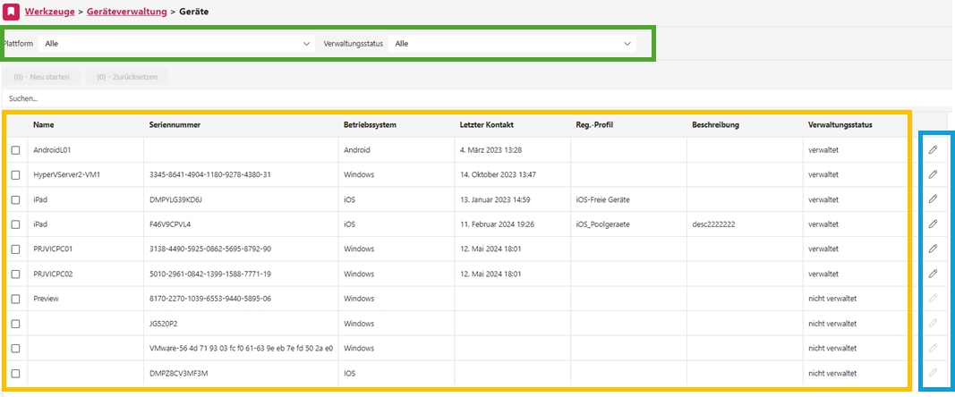 Hier sehen Sie nun eine Filterleiste, eine Übersicht Ihrer Endgeräte sowie eine Symbolleiste. Im Folgenden werden wir Ihnen die einzelnen Funktionen näher beschreiben und erklären, was Sie hier machen können.