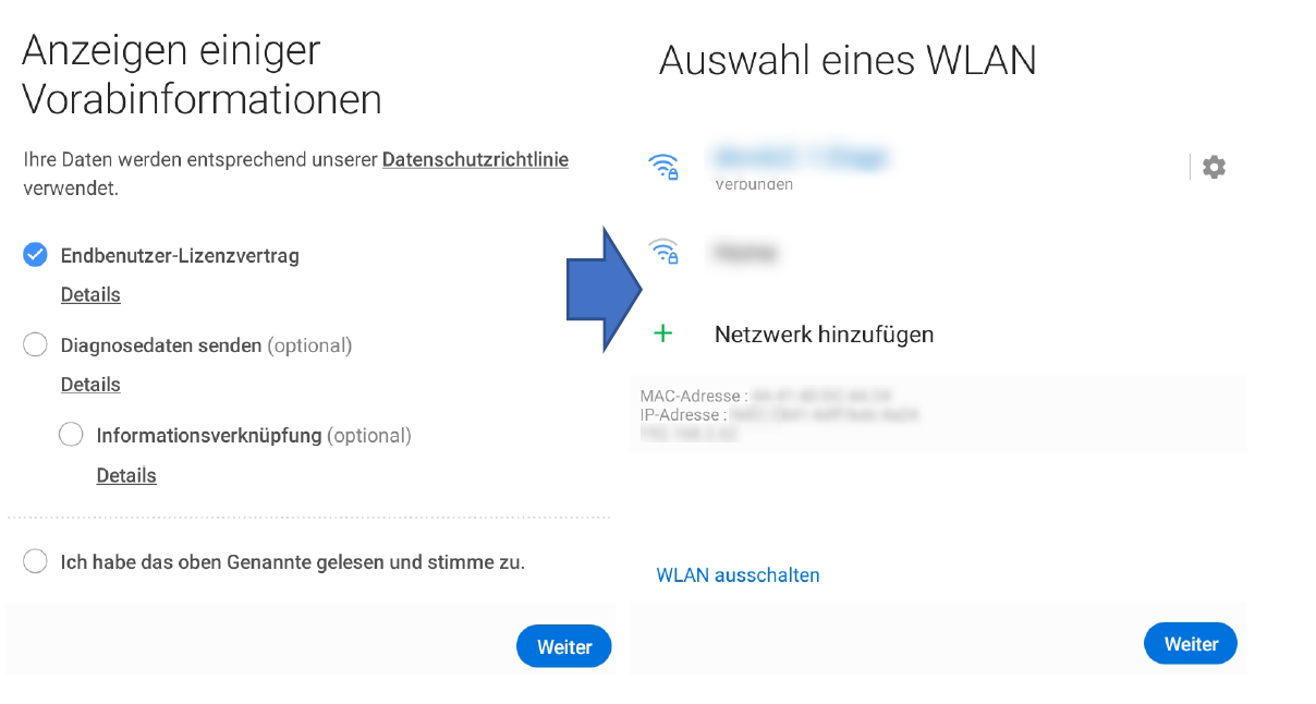 Starten Sie die Einrichtung, indem Sie dem Endbenutzer-Lizenzvertrag zustimmen, sich mit einem WLAN-Netz verbinden und „Weiter“ auswählen.