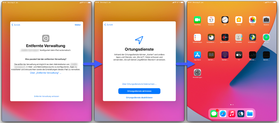 Bestätigen Sie im nächsten Schritt die Entfernte Verwaltung mit „Weiter“. An dieser Stelle wird schon die verwaltende Organisation (im Normalfall der Name der Schule) angezeigt. Zur automatischen Einstellung der Uhrzeit sollten die Ortungsdiente bei einer Abfrage bestätigt werden. Das Gerät wird dann automatisch registriert. Und kann anschließend schon genutzt werden. Die zugewiesenen Apps und Konfigurationen werden im Hintergrund automatisch installiert.
