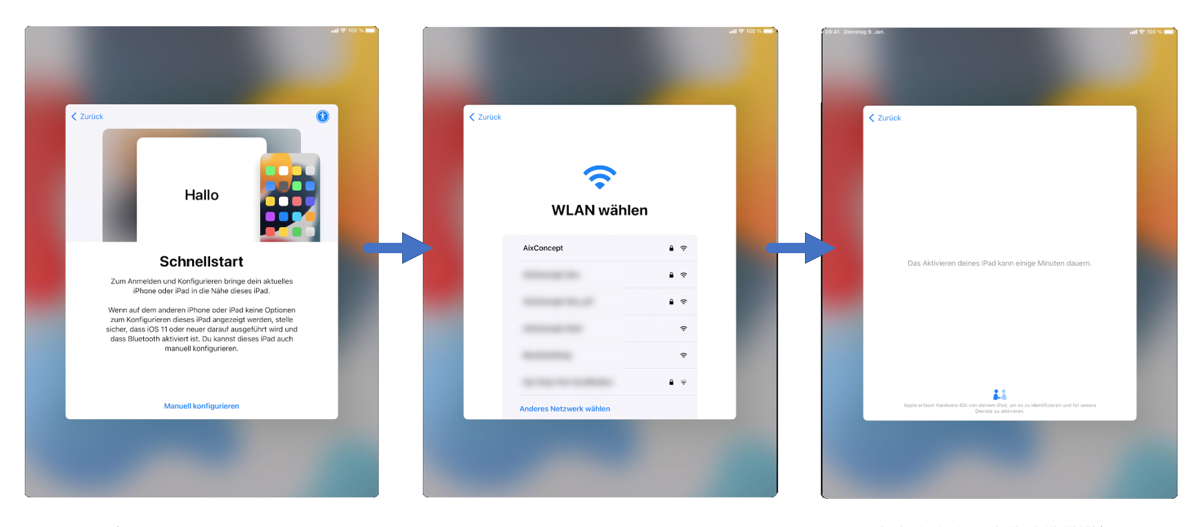 Diese werden standardmäßig auf alle Geräte, welche Mitglieder der automatisch befüllten Gerätegruppen „_iOS_Lehrergeraete“ bzw. „_iOS_Schuelergeraete“ sind, angewendet. Diese Kurzanleitung dient dazu, den allgemeinen Vorgang der Inbetriebnahme der Geräte zu beschreiben.