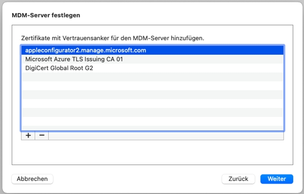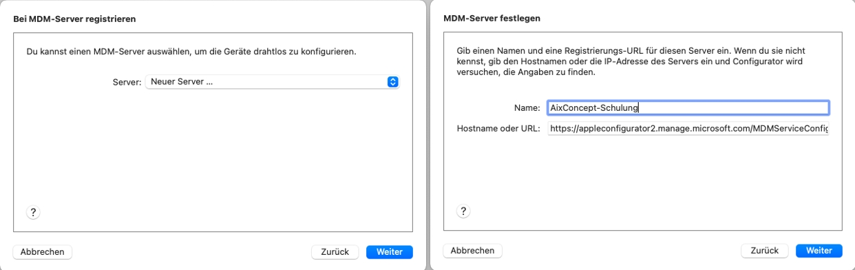 Manuelle Konfiguration An dieser Stelle wird nun ein neuer MDM-Server eingerichtet. Die Registrierungs-URL kann über den Support angefragt werden.