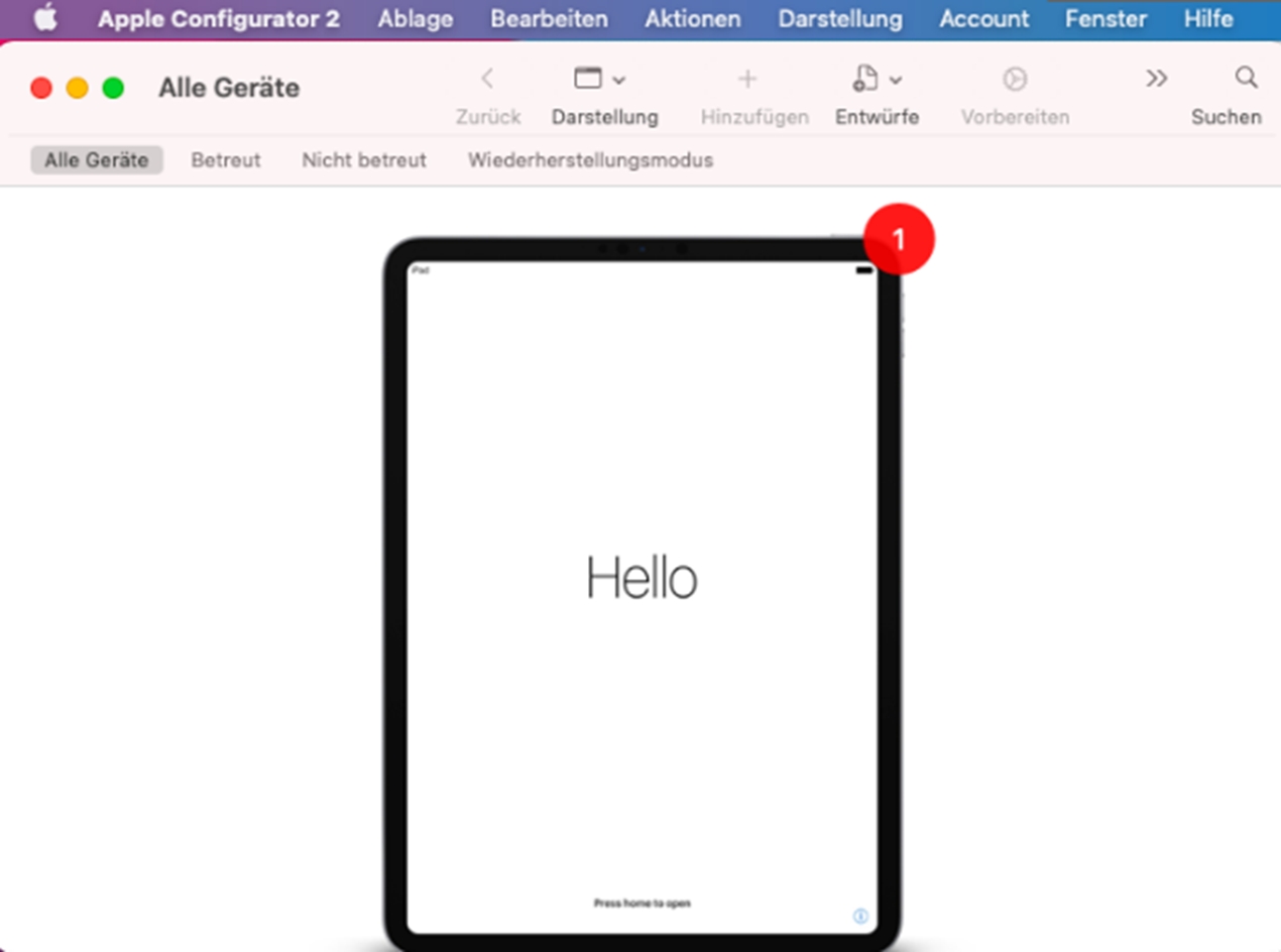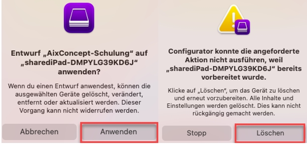 In diesem Zustand dürfen die Geräte noch nicht weiter installiert werden, da sie noch der Configurator-App zugewiesen sind und noch eine Fehlermeldung über ein unvollständiges Profil angezeigt würde.