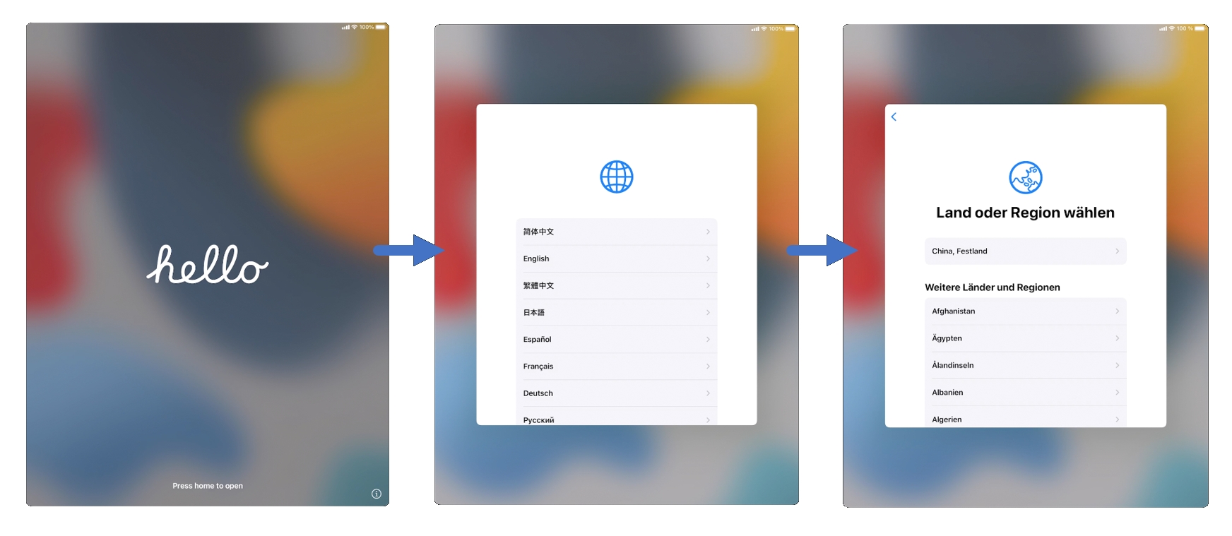 Beginnen Sie die Einrichtung mit Druck auf die Home-Taste, wählen sie die Sprache und Region aus: