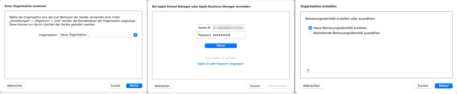 Zertifikate für MDM-Server auswählen Im nächsten Schritt erfolgt die Anmeldung am ASM. Hierfür „Neue Organisation“ auswählen, im nächsten Schritt die Daten eines ASM-Administrators eingeben und schließlich „Neue Betreuungsidentität erstellen auswählen.