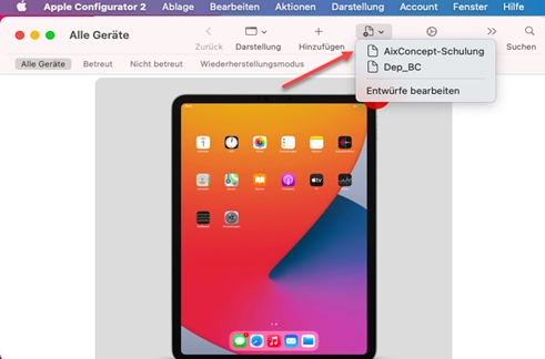 Um die iOS-Geräte nun einzubinden, werden diese per USB an das MacOS-Gerät, auf welchem Apple Configurator 2 ausgeführt wird, angeschlossen. Die Geräte werden ausgewählt und über den Reiter „Entwürfe“ kann direkt der gewünschte Entwurf auf den Geräten angewendet werden.