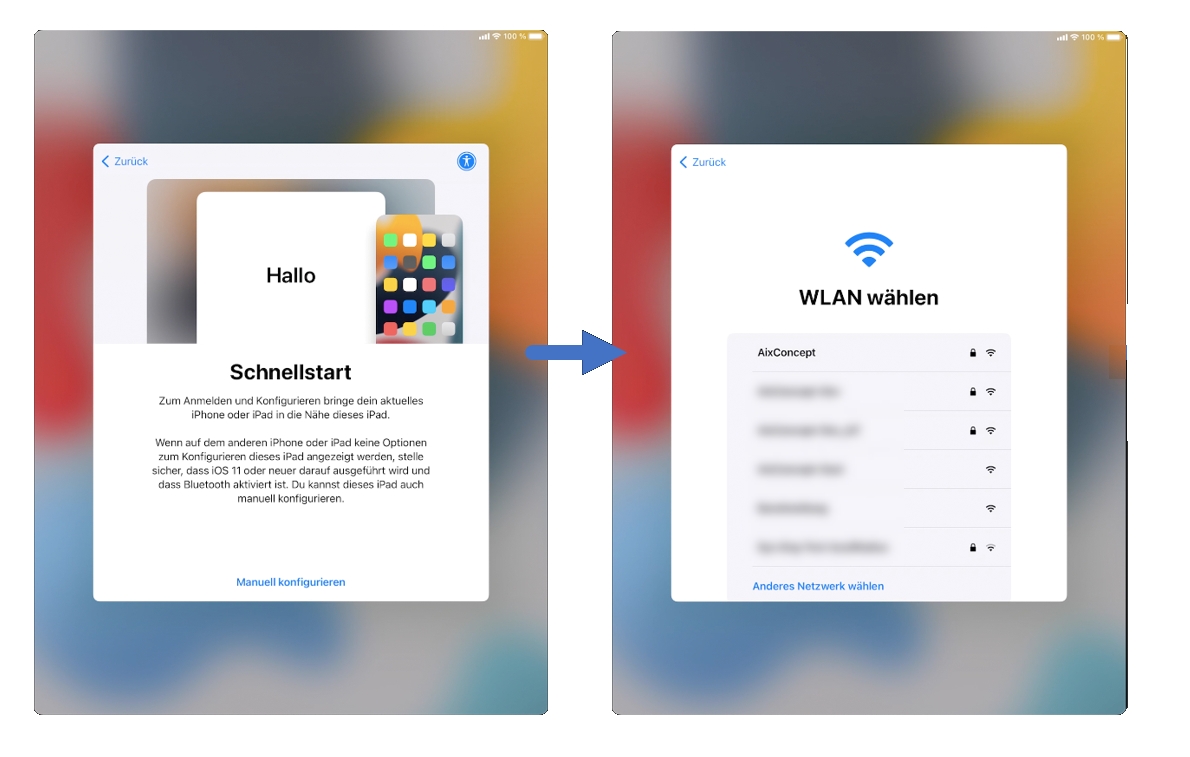 Öffnen Sie die Apple Configurator App auf dem iPhone und halten Sie das Gerät über das iPad, der Prozess wird gestartet, das iPad verbindet sich mit dem WLAN welches am iPhone eingerichtet ist.