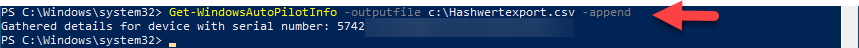 7. Führen Sie folgenden Befehl aus und passen Sie vorher ggf. den Pfad und Namen der Datei an : "**Get-WindowsAutoPilotInfo -Outputfile C:\Hashwertexport.csv**" <br>