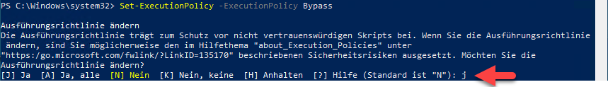 6. Erlauben Sie das Ausführen von Skripten mittels des Befehls **"Set-ExecutionPolicy -ExecutionPolicy Bypass"** und bestätigen Sie dies mit J (Ja)<br>