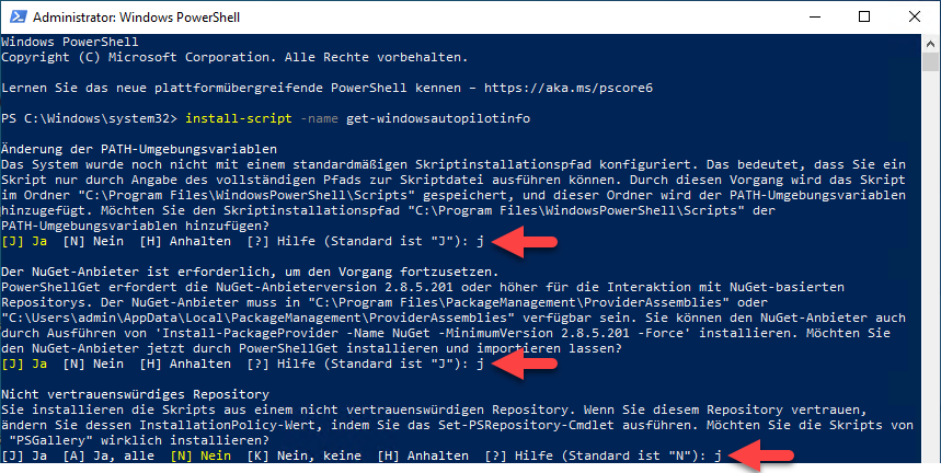 4. Wenn Ihre Powershell noch nicht konfiguriert ist, werden Sie mit folgenden Fragen konfrontiert: (Beantworten Sie alle mit **Ja** oder **J**)