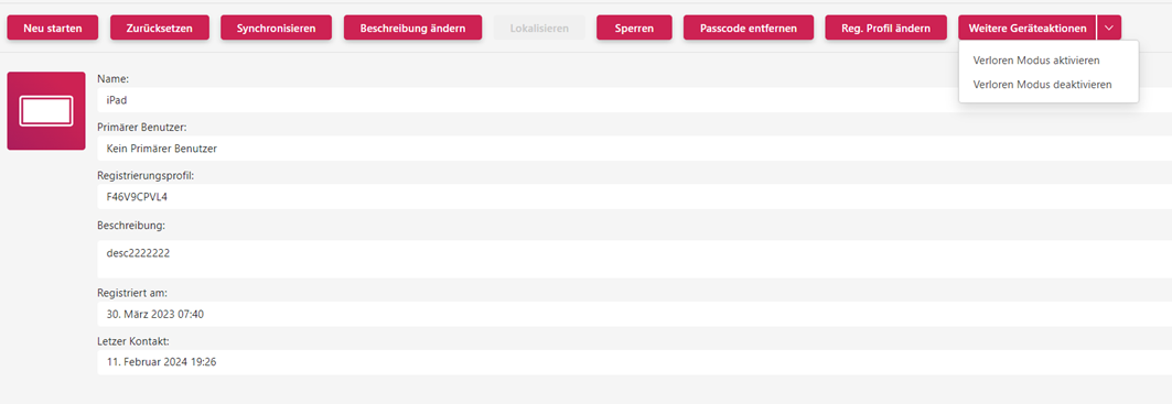 Wesentlicher Unterschied für die iOS-Endgeräte stellen die **Weiteren Geräteoptionen** dar (siehe Abbildung 42). Hier haben Sie die Möglichkeit, den **Verloren Modus** zu aktivieren. Dieser ermöglicht es Ihnen Ihre verlorenen oder gestohlenen Geräte zu orten, zu sperren und eine Nachricht auf dem Sperrbildschirm anzuzeigen.&#x20;