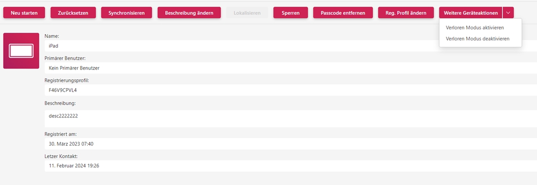 Wesentlicher Unterschied für die iOS-Endgeräte stellen die Weiteren Geräteoptionen dar (siehe Abbildung 42). Hier haben Sie die Möglichkeit, den Verloren Modus zu aktivieren. Dieser ermöglicht es Ihnen Ihre verlorenen oder gestohlenen Geräte zu orten, zu sperren und eine Nachricht auf dem Sperrbildschirm anzuzeigen.