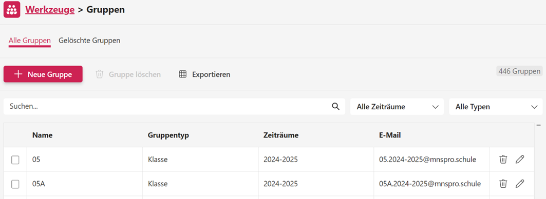 In diesem Abschnitt finden Sie alle Klassen, Kurse und Arbeitsgruppen, die bereits für Ihre Schule eingerichtet wurden. Sie können diese Liste bequem nach Schuljahren und Typen – also ob es sich um eine Klasse, einen Kurs oder eine Arbeitsgruppe handelt – filtern (siehe Abbildung 15).