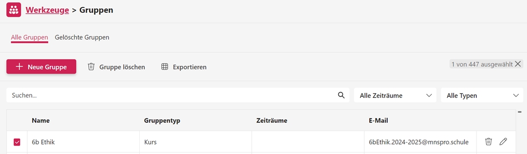 Wenn Sie eine oder mehrere Gruppen löschen möchten, markieren Sie diese in der Übersicht und klicken anschließend auf Gruppe löschen (siehe Abbildung 22).