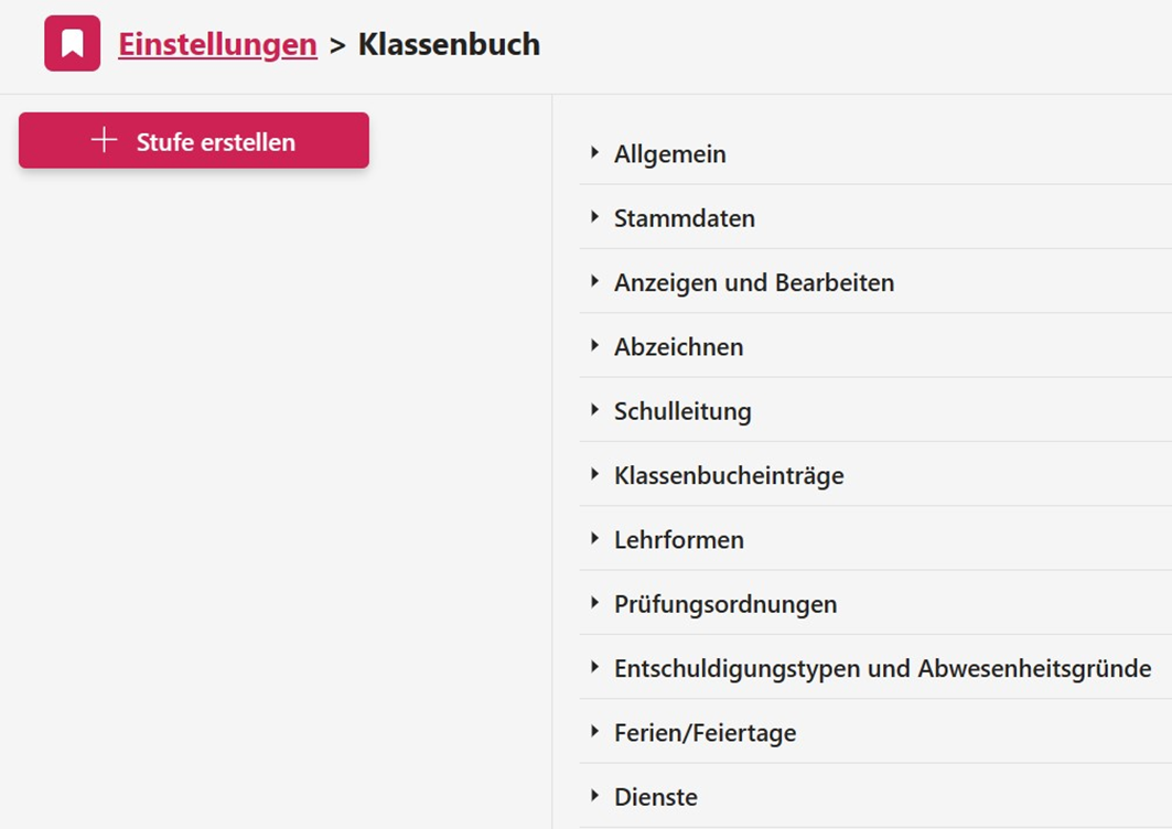 Nachdem Sie ein Schuljahr definiert und aktiviert haben, wenden Sie sich den Einstellungen des Klassenbuchs zu. Dazu klicken Sie auf die Kachel "Klassenbuch" unter dem Punkt "Einstellungen" (siehe Abbildung 1). Es öffnet sich dann folgende Seite, auf der Sie auf der linken Seite die Option haben, eine Stufe zu erstellen, und auf der rechten Seite befinden sich diverse Einzeloptionen (siehe Abbildung 5).