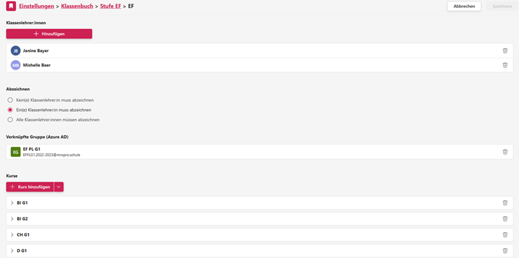 Öffnen Sie die neu angelegte Klasse und wählen Sie die Klassenlehrkräfte aus. Bestimmen Sie auch, wie viele der Klassenlehrkräfte die Abzeichnung vornehmen können. Alle Kurslehrer sollten zu Klassenlehrern ernannt werden, damit eine Abzeichnung der Kurse erfolgen kann, da eine Klasse mehrere Kurse enthält, die von verschiedenen Kurslehrern geleitet werden (Abbildung 31).