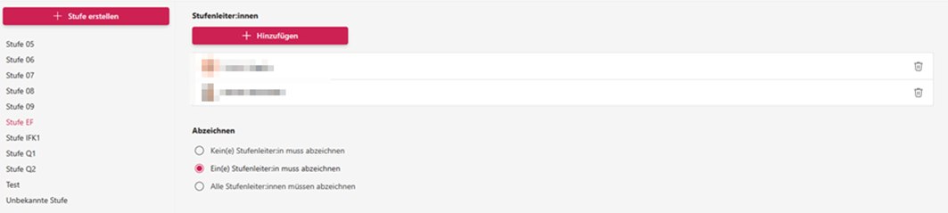 Wir klicken auf die einzurichtende Stufe und beginnen mit der Einrichtung, indem wir Stufenleitungen festlegen und entscheiden, ob eine oder mehrere Stufenleitungen die Klassenbücher der Stufe vor der finalen Abzeichnung durch die Schulleitung abzeichnen sollen (siehe Abbildung 29).