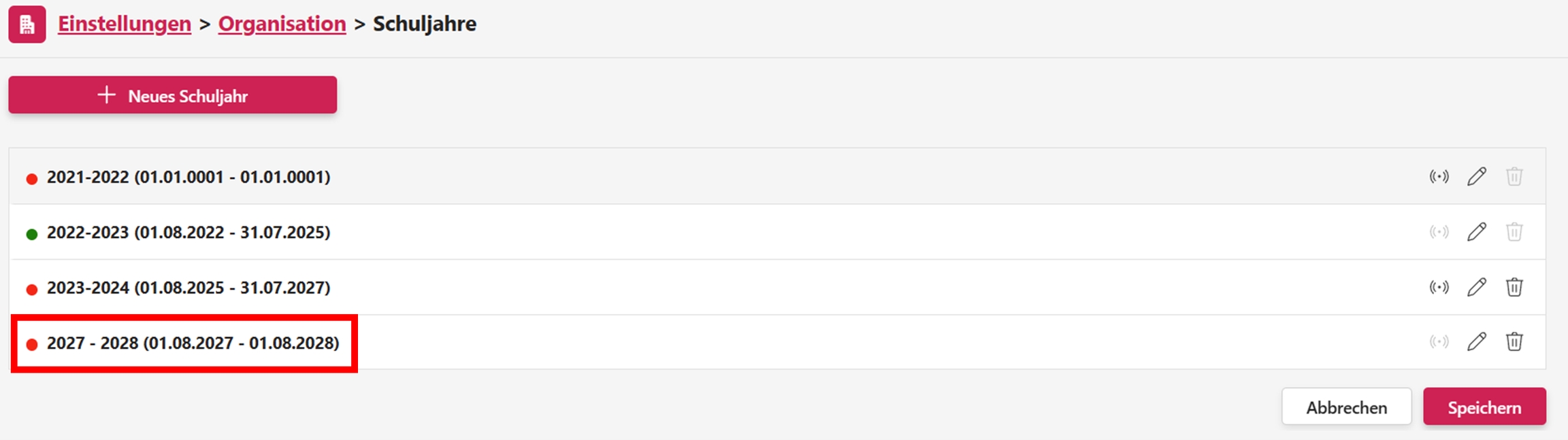 Zum Abschluss müssen Sie nun die Eintragung speichern. Dabei wird das Schuljahr jedoch nicht automatisch aktiviert. Wie bereits erwähnt, müssen Sie ein Schuljahr bewusst über das Symbol links neben dem Stift-Symbol aktivieren.