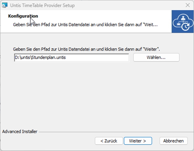 Durch Klick auf Weiter gelangen Sie zu einem Dialog, wo der Speicherort des Untis TimeTableProviders ausgewählt werden kann (siehe Abbildung 25).