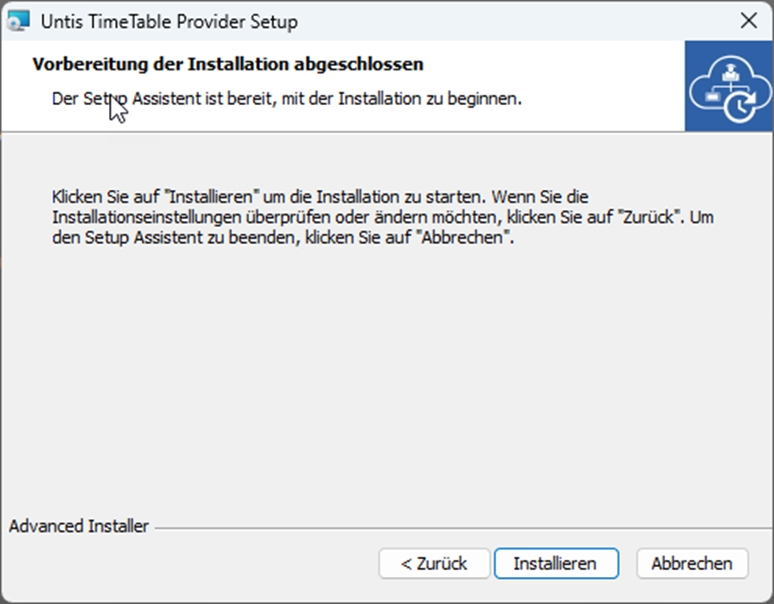 Sind die zuvor dokumentierten Voraussetzungen alle erfüllt, kann mit dem Download der UntisProvider.msi fortgefahren werden und das Tool ausgeführt und anschließend den Einrichtungsanweisungen gefolgt werden (siehe Abbildung 22).