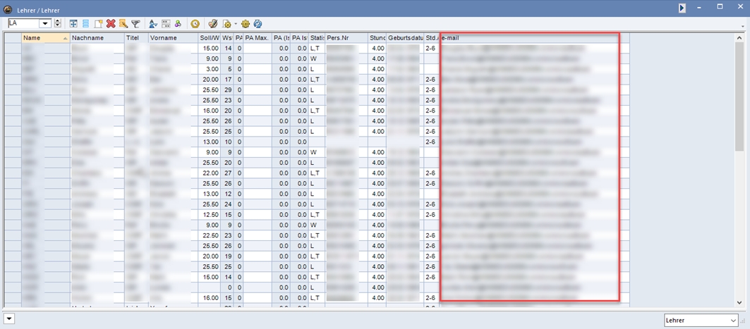 Damit der Import der Untisdaten fehlerfrei funktioniert müssen Sie bei Untis die Stammdaten der Lehrkräfte anpassen und um die E-Mail-Adresse ergänzen, die diese bei MNSpro Cloud zugewiesen bekommen haben (Abbildungen 20).