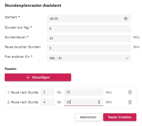 Öffne die Maske für die Stundenplaneinstellungen und trage die benötigten Informationen ein, z. B. die Anzahl der Schulstunden, die Dauer der einzelnen Stunden und die Anzahl und Länge der Pausen.