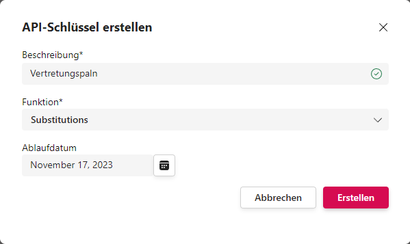 Als Funktion muss die Option Substitutions ausgewählt werden und als Zeitraum empfiehlt sich das Schuljahresende einzutragen, in dem mithilfe dieses API-Schlüssels eine Synchronisation durchgeführt werden soll.