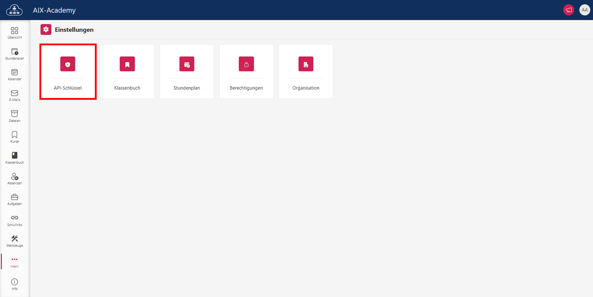 Zur Einrichtung benötigen Sie einen API-Schlüssel. Um einen neuen API-Schlüssel für die Stundenplan-Synchronisierung zwischen UNTIS und dem MNSpro Klassenbuch zu generieren, müssen die folgenden Menüpunkte im MNSpro Cloud Dashboard angesteuert werden (die entsprechenden Menüpunkte sind rot umrandet):