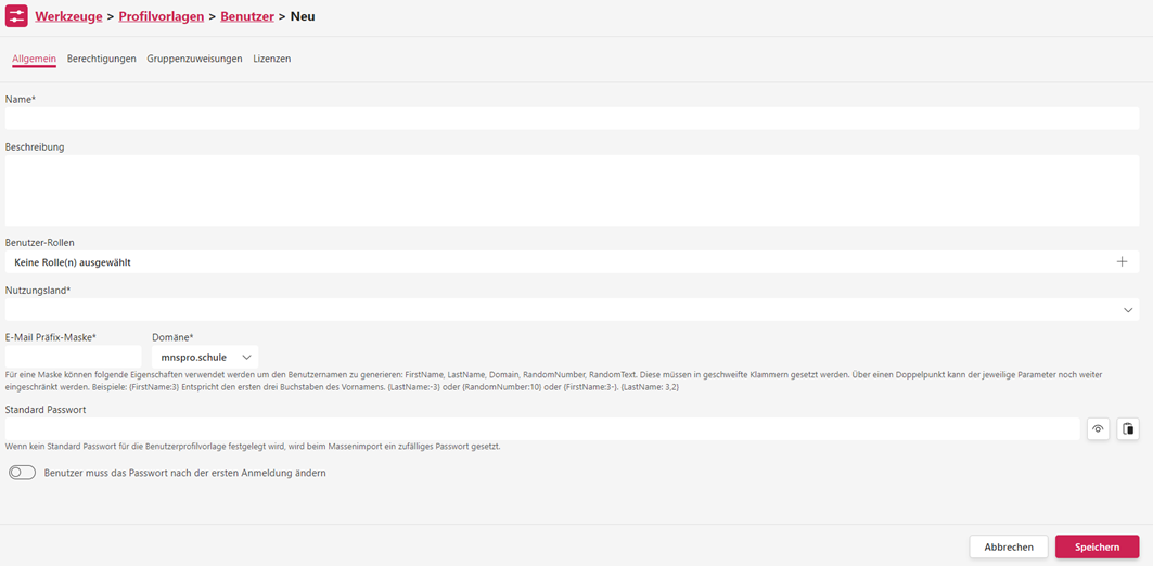 Unter dem ersten Reiter werden Sie gebeten, der Profilvorlage einen Namen und eine kurze Beschreibung zu geben. Anschließend definieren Sie die Benutzerrollen und das Nutzungsland. Letzteres bestimmt die Standardspracheinstellung von MNSpro für Benutzer, die dieser Profilvorlage zugeordnet werden.