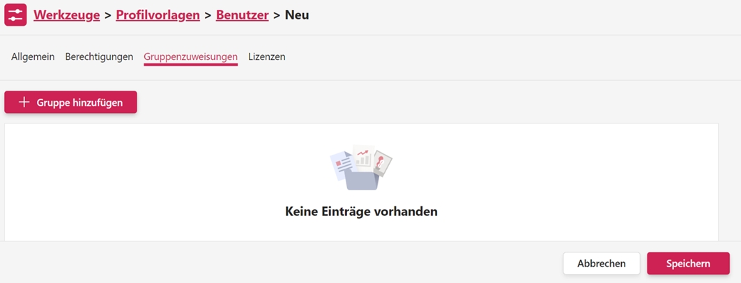 Unter dem Reiter Gruppenzuweisung haben Sie die Möglichkeit, die Gültigkeit der Profilvorlage auf individuelle Gruppen zu beschränken (siehe Abbildung 11). Dazu klicken Sie auf den Button Gruppe hinzufügen und wählen die Gruppen aus, auf die sich die Gültigkeit bezieht.