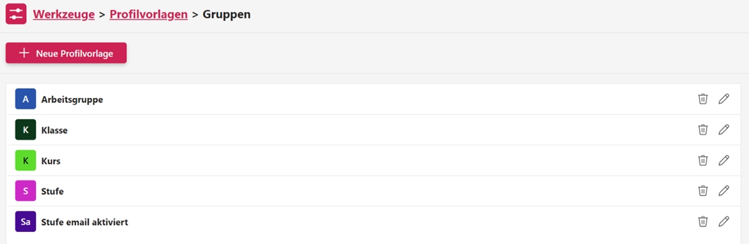 Über die Kachel Gruppe (siehe Abbildung 7) gelangen Sie zu den Profilen der Gruppe (siehe Abbildung 13). Diese ist dabei ähnlich aufgebaut wie die Übersicht der Benutzerprofile, und auch hier hat AixConcept bereits Gruppenprofile erstellt, die sich in der Praxis als sinnvoll erwiesen haben.