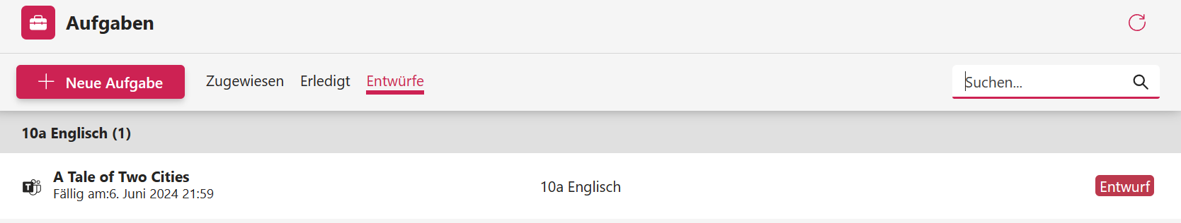 Wann immer Sie eine Aufgabe erstellen und speichern, jedoch nicht zuweisen, wird sie unter Entwürfe abgelegt. Sie können dann zu einem späteren Zeitpunkt darauf zugreifen, sie anpassen, verändern, löschen oder zuweisen.