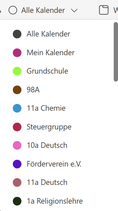 Die **Kalenderauswahl** ermöglicht es Ihnen, gezielt einzelne Kalender, beispielsweise von Kursen, anzuzeigen oder alle Eintragungen über alle Kalender hinweg auf einmal zu betrachten. In diesem Fall werden die einzelnen Eintragungen farblich gekennzeichnet.
