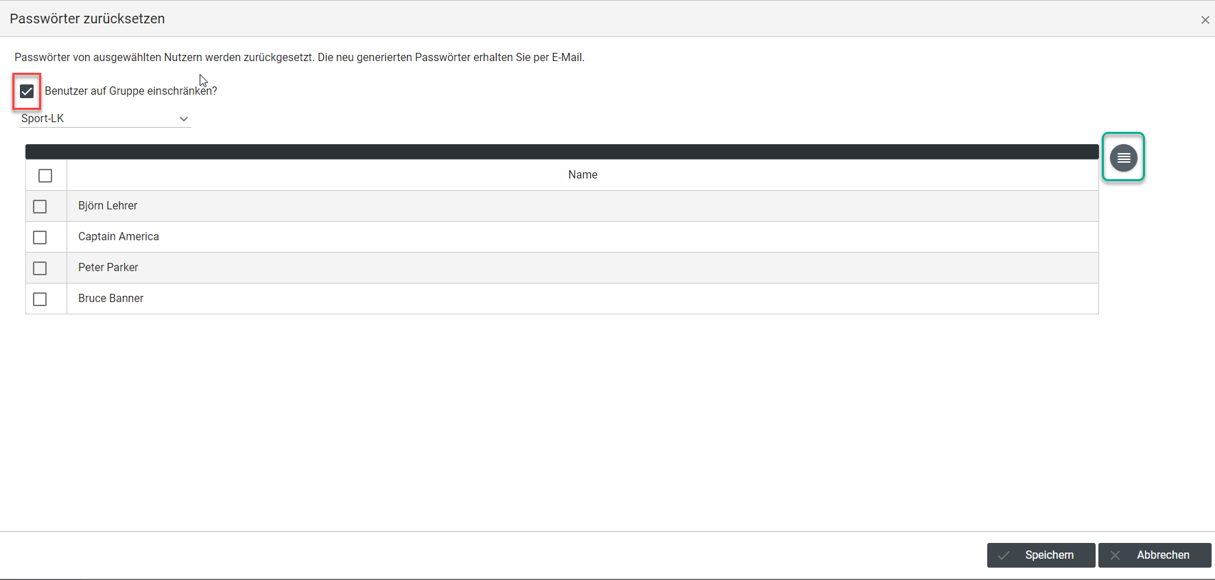 Anschließend haben Sie zwei Möglichkeiten mehrere Passwörter gleichzeitig zurückzusetzen. Entweder Sie öffnen die Liste (s. Abbildung 94.1 grüner Kreis) oder Sie schränken die Benutzer auf eine Gruppe ein. (s. Abbildung 94.1 rote Umrandung). Sobald Sie die Benutzer auf eine Gruppe einschränken, wird Ihnen über den grünen Kreis auch nur noch die Teilnehmer des Kurses angezeigt! Wählen Sie in beiden Fällen die Benutzer aus wo Sie die Passwörter zurücksetzen wollen und klicken abschließend auf Speichern!