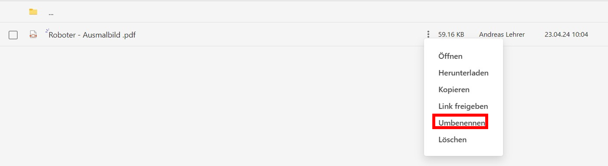 Sie können einzelne Dateien oder Ordner natürlich auch umbenennen. Klicken Sie dazu einfach auf die drei Punkte neben dem entsprechenden Ordner oder der Datei und wählen Sie den Punkt Umbenennen (siehe Abb. 38).