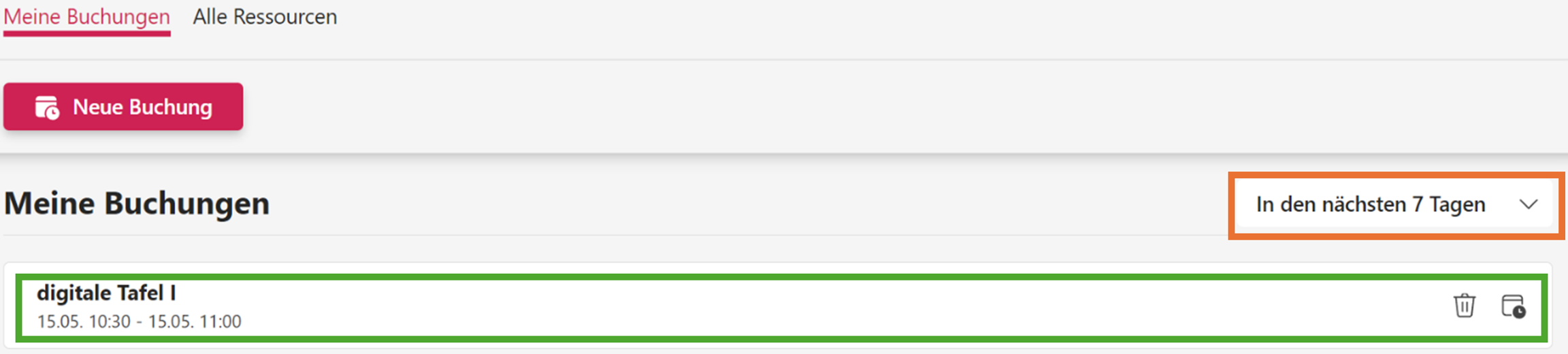 Über das Kalender-Symbol rechts einer Buchung können Sie diese im Kalender einsehen. Durch Klicken auf das Mülltonnen-Symbol können Sie die Buchung löschen.