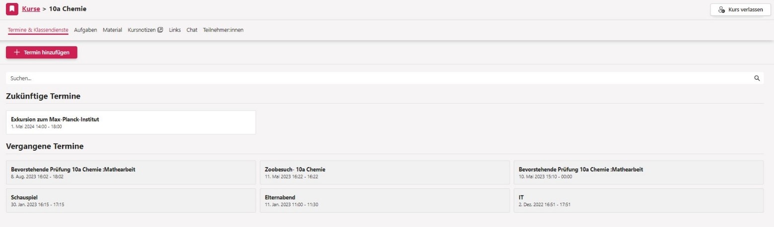 Sobald Sie auf einen Kurs klicken, öffnet sich das Kursbuch, in dem Sie sofort alle anstehenden und vergangenen Termine des Kurses sehen können (Abb. 41).