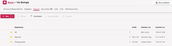 Wie schon im Kapitel Meine Dokumente angesprochen, kann man in MNSpro Cloud Material hochladen, organisieren und strukturieren. Zugang zu der Materialverwaltung haben Sie auch in den Kursen (Abb. 43).